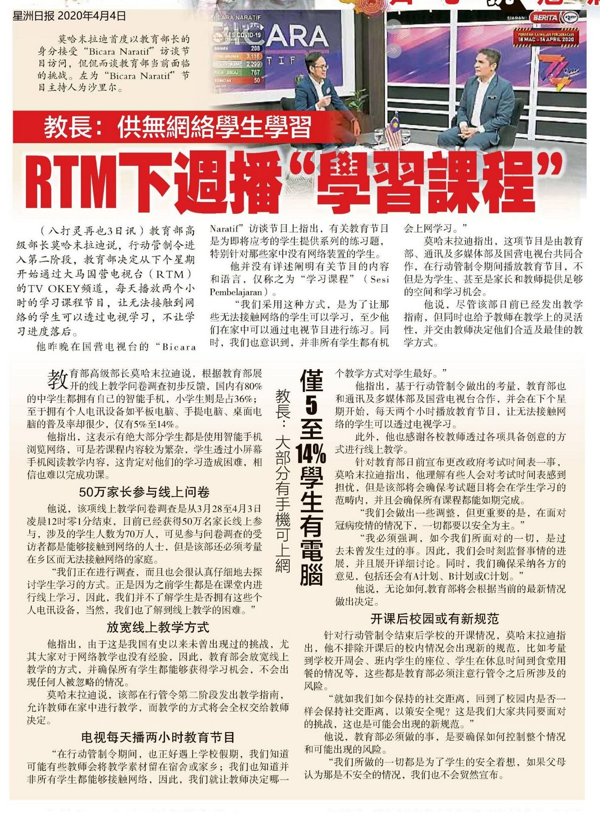 教长:供无网络学生学习 RTM下周播“学习课程”