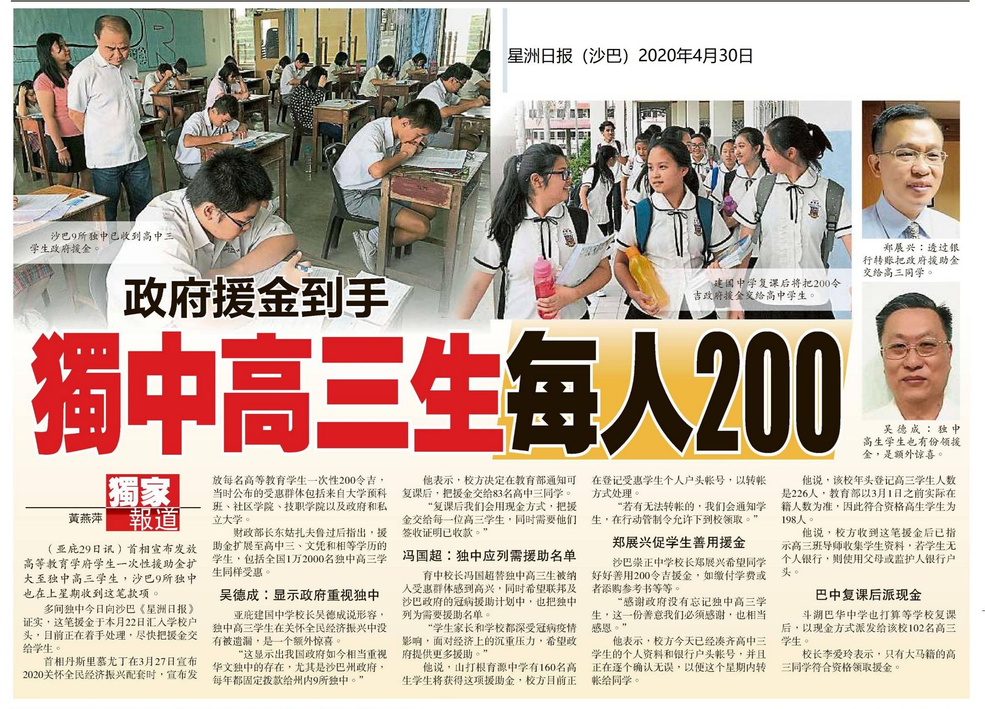 政府援助金到手 独中高三生每人200 WhatsApp 上一篇文章: SPM SVM STPM STAM学校若复课 仅限考试班 上一页 下一篇文章: 陈大锦:砂5独中生未获200援金“技术或沟通误解导致” 下一页