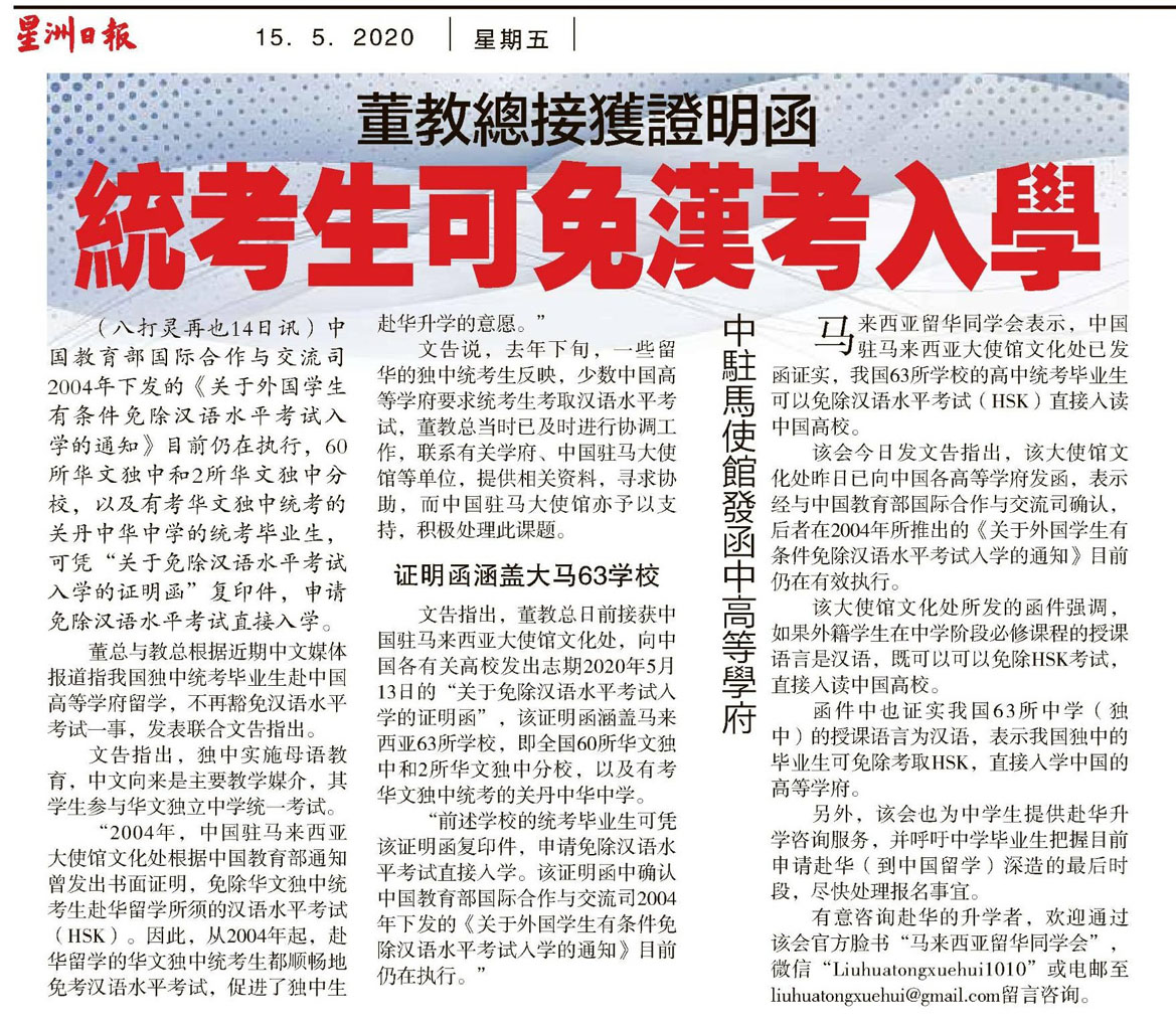 董教总接获证明函 统考生可免汉考入学