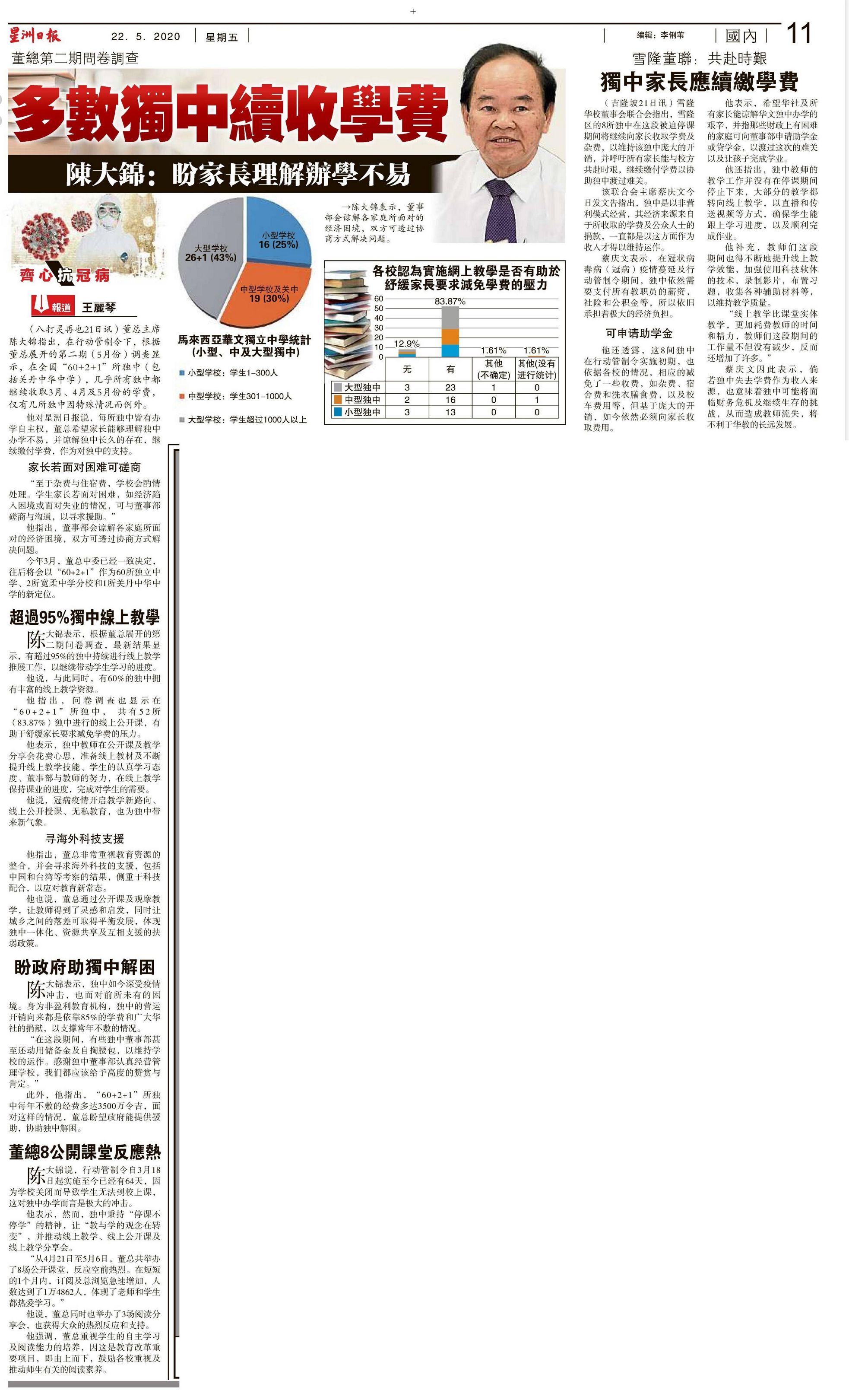 多数独中续收学费 陈大锦:盼家长理解办学不易
