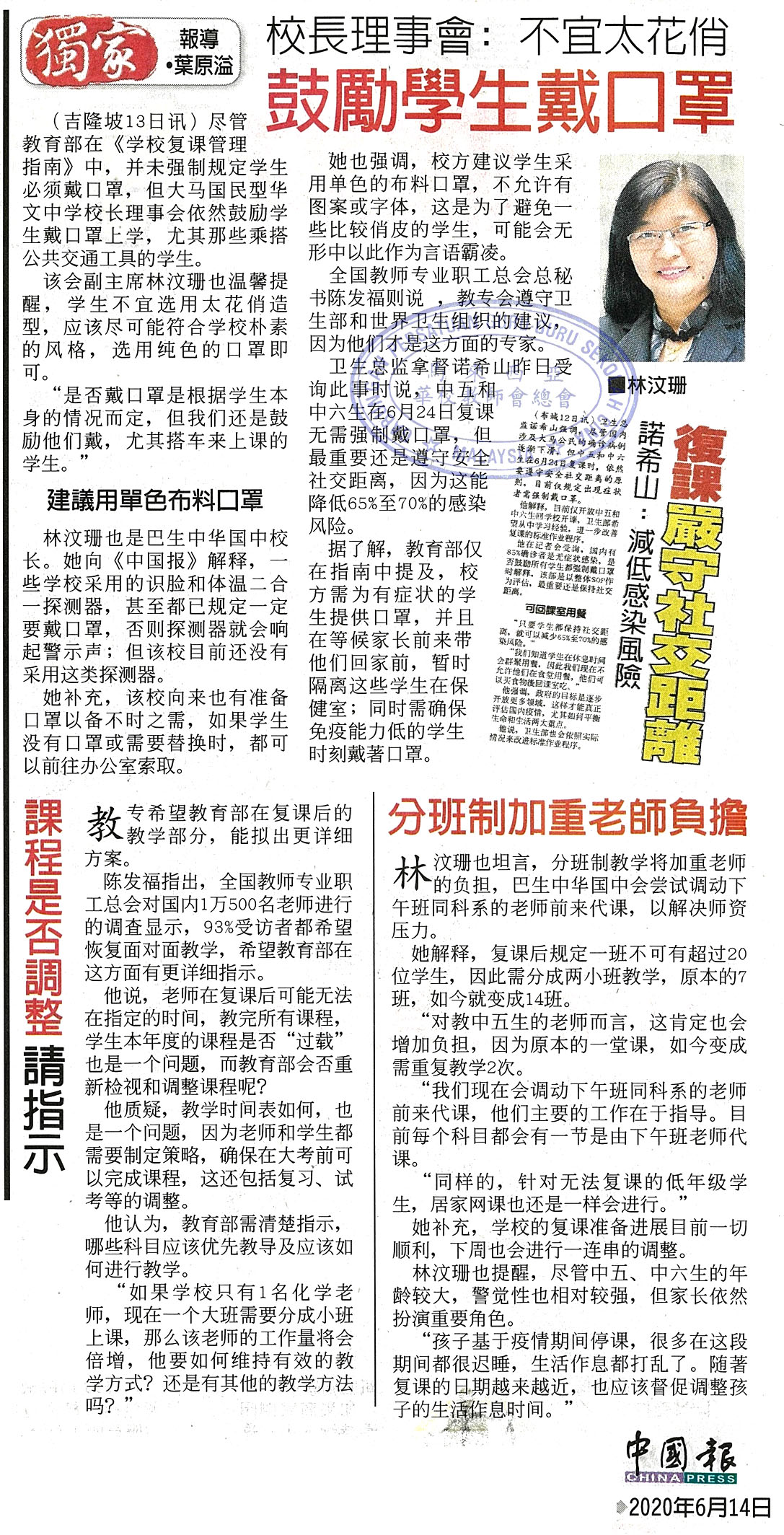 校长理事会:不宜太花俏 鼓励学生戴口罩 WhatsApp 上一篇文章: 应考生年终假期或缩短 确保赶上考试进度 上一页 下一篇文章: ‘SCHOOL SOP REVIEW FROM TIME TO TIME’ 下一页