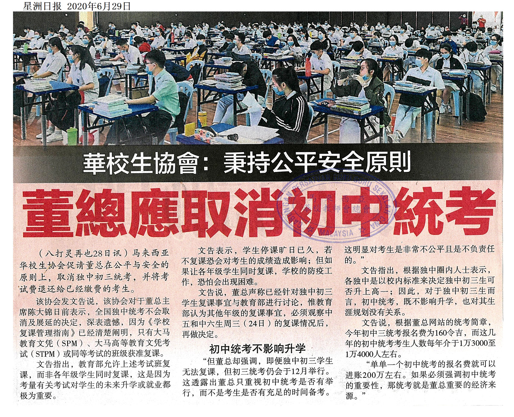 华校生协会:秉持公平安全原则 董总应取消初中统考