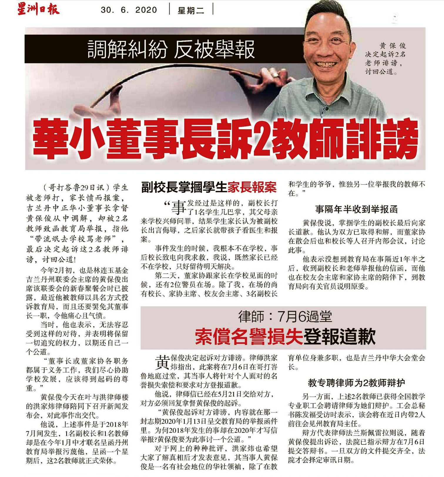 调解纠纷 反被举报 华小董事长诉2教师毁谤