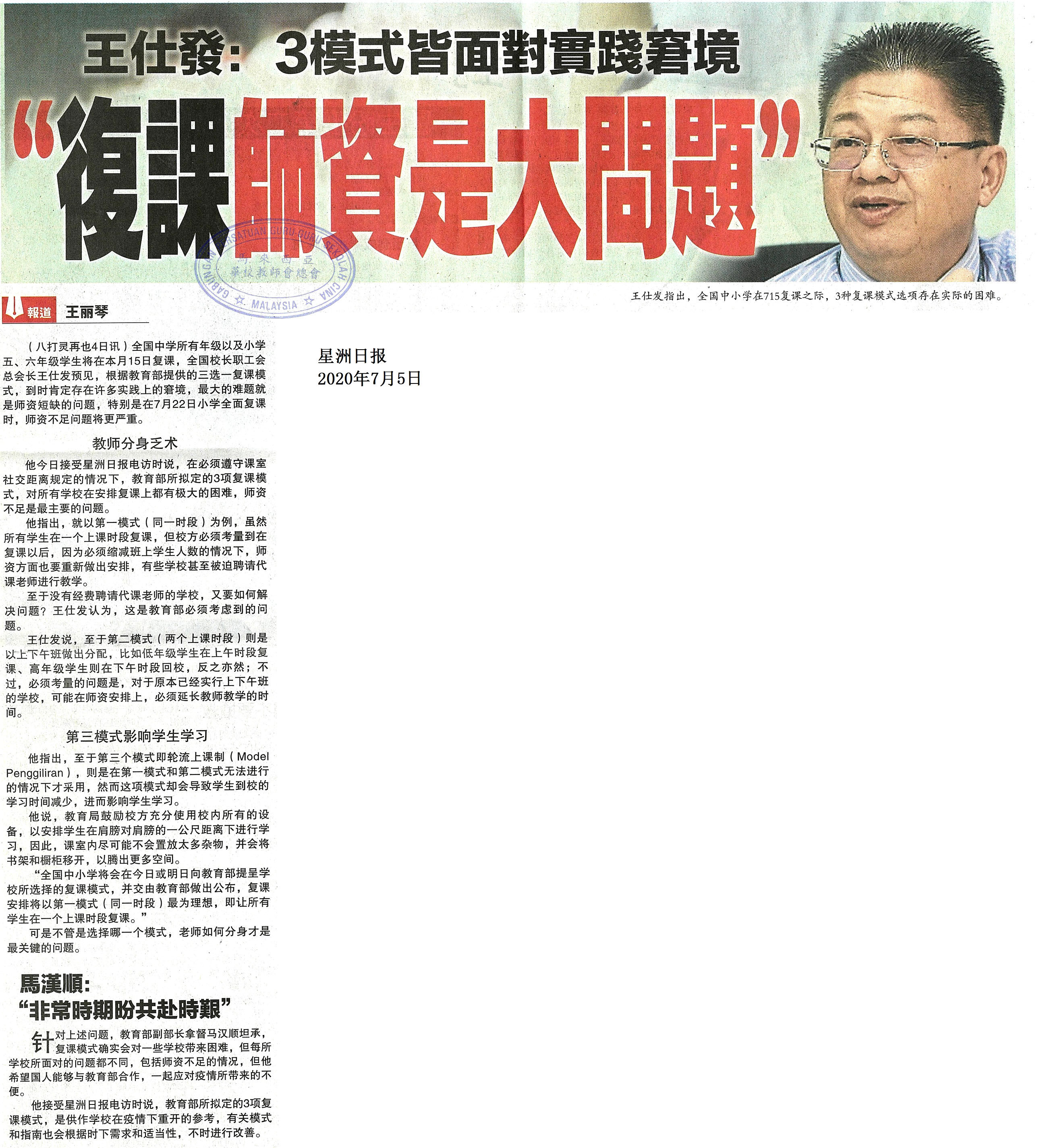 王仕发:3模式皆面对实践窘境 “复课师资是大问题”
