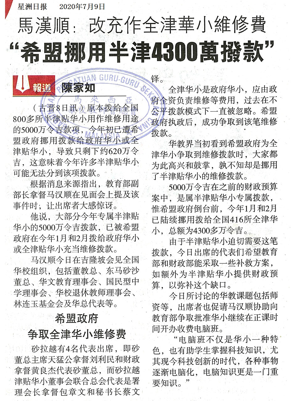 马汉顺:改充作全津华小维修费 “希盟挪用半津4300万拨款” WhatsApp 上一篇文章: 副教育总监:若担心染冠病 父母可不让孩子上学 上一页 下一篇文章: 高教部长:学生分阶段回校 大专10月全面开学 下一页