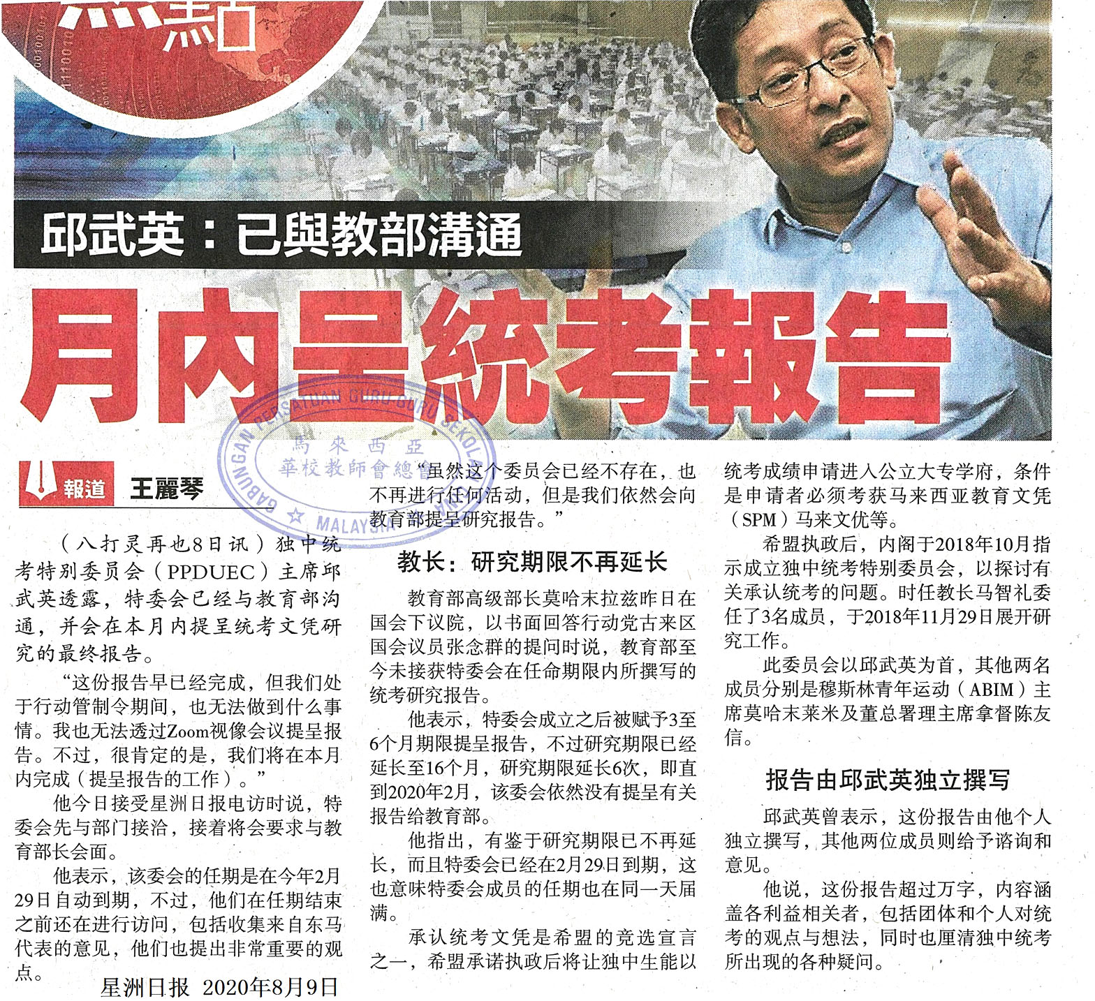 邱武英:已与教部沟通 月内呈统考报告