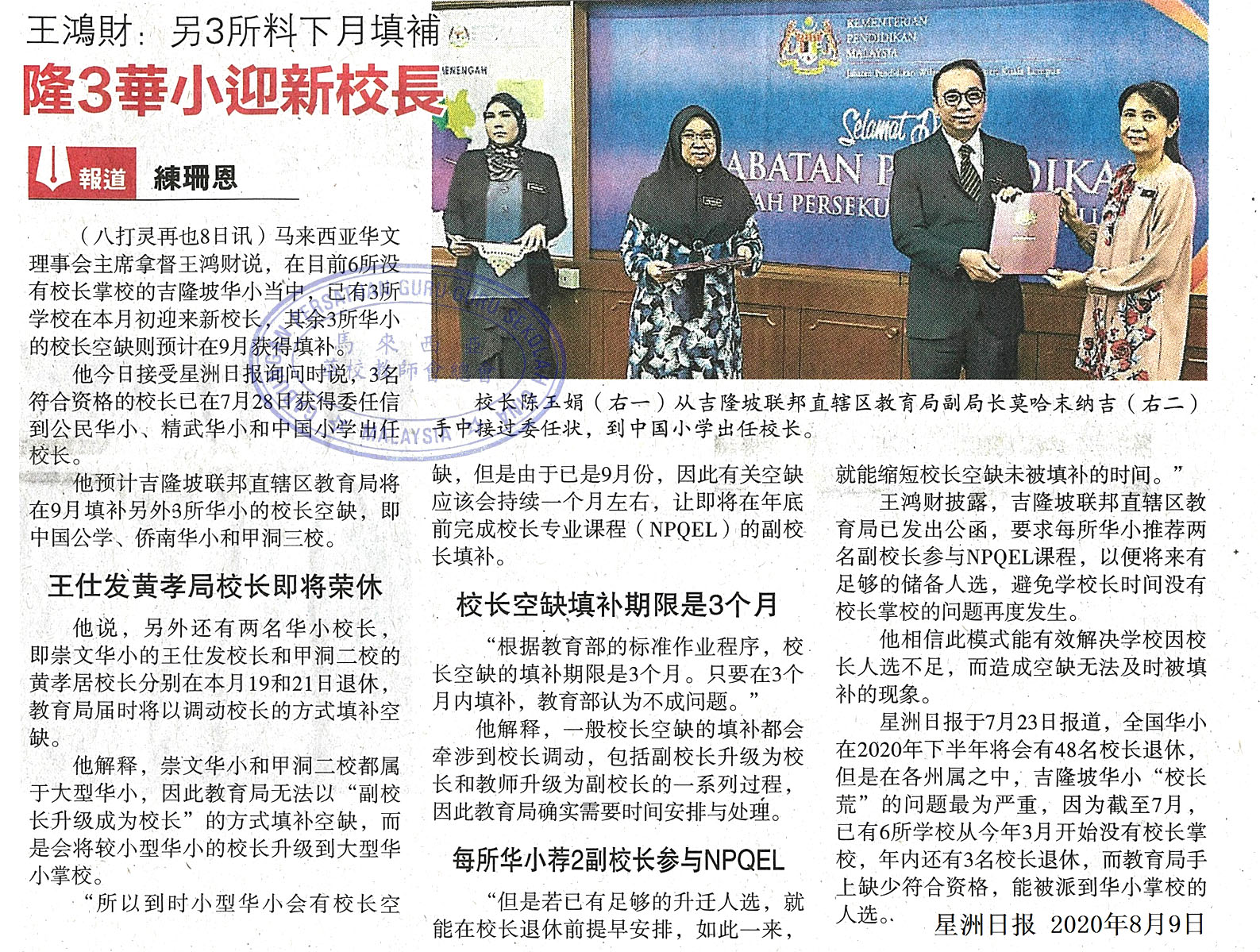 王鸿财:另3所料下月填补 隆3华小迎新校长