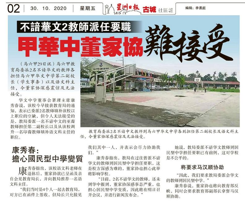 不谙华文2教师派任要职 甲华中董家协难接受