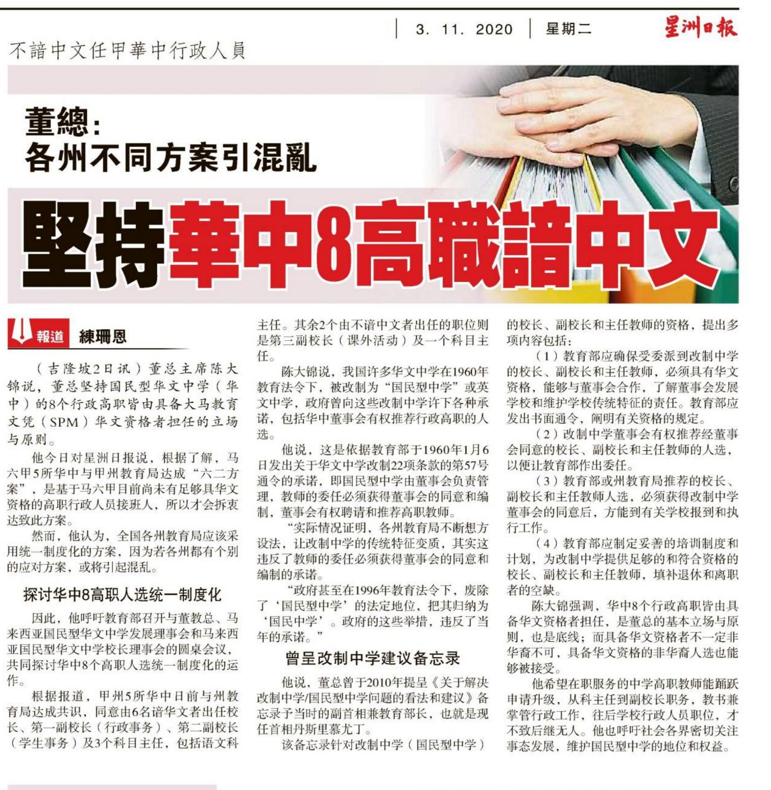 董总:各州不同方案引混乱 坚持华中8高职谙华文