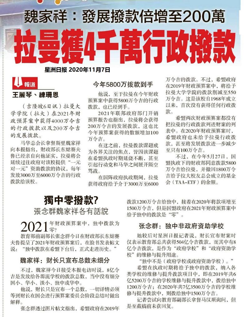 魏家祥:发展拨款培增至200万 拉曼获4千万行政拨款