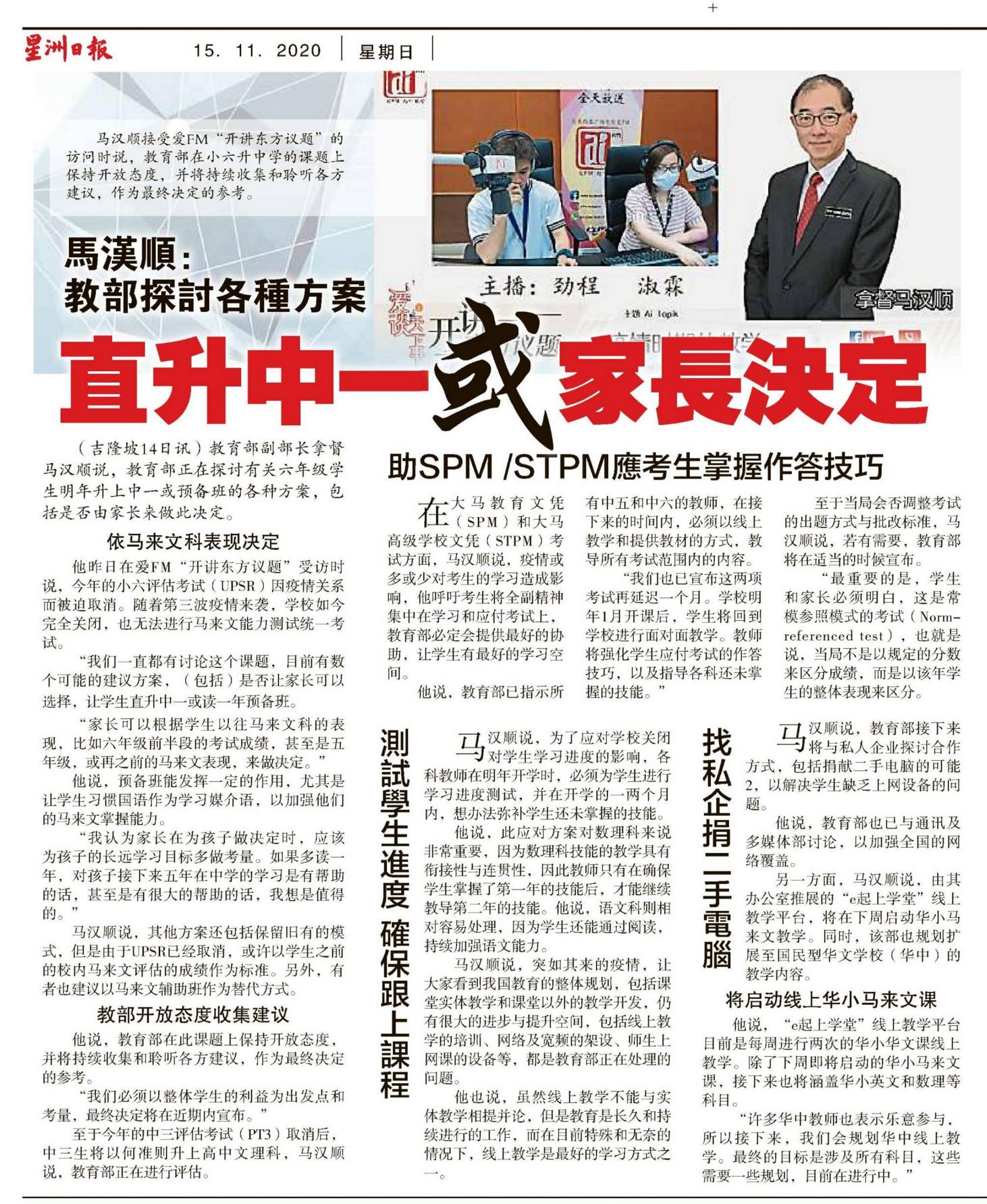 马汉顺:教育部探讨各种方案 直升中一或家长决定
