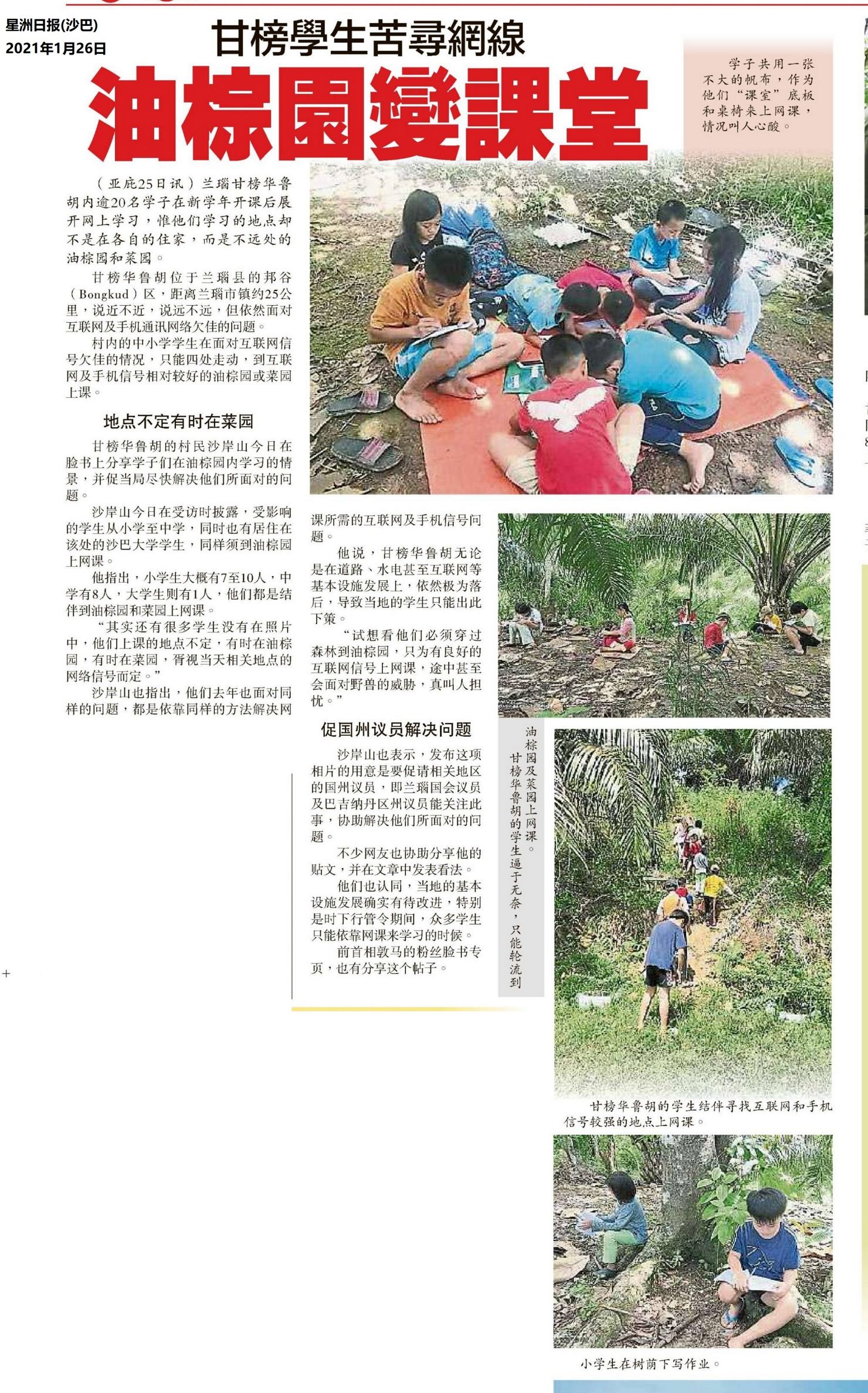甘榜学生苦寻网线 油棕园变课室