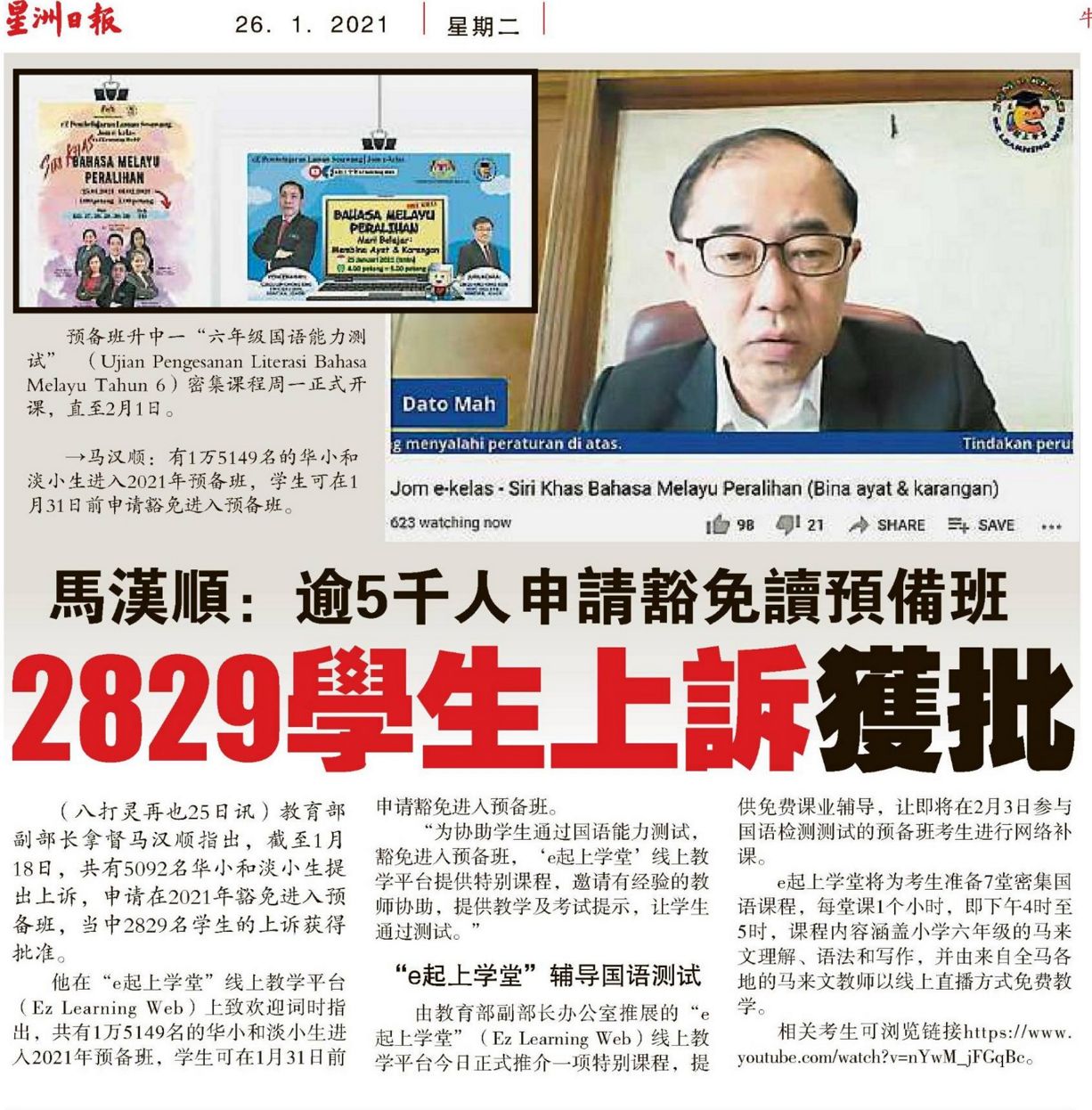 马汉顺:逾5千人申请豁免读预备班 2829学生上诉获批