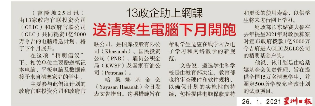 13政企助上网课 送清寒生电脑下月开跑