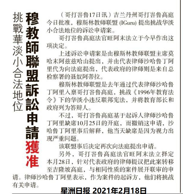 挑战华淡小合法地位 穆教师联盟诉讼申请获准 WhatsApp 上一篇文章: 王鸿财:华社须宣导华小实况 “勿放任伪华人散播” 上一页 下一篇文章: 曹观友:维修校园设施 槟城批836万制度化拨款 下一页