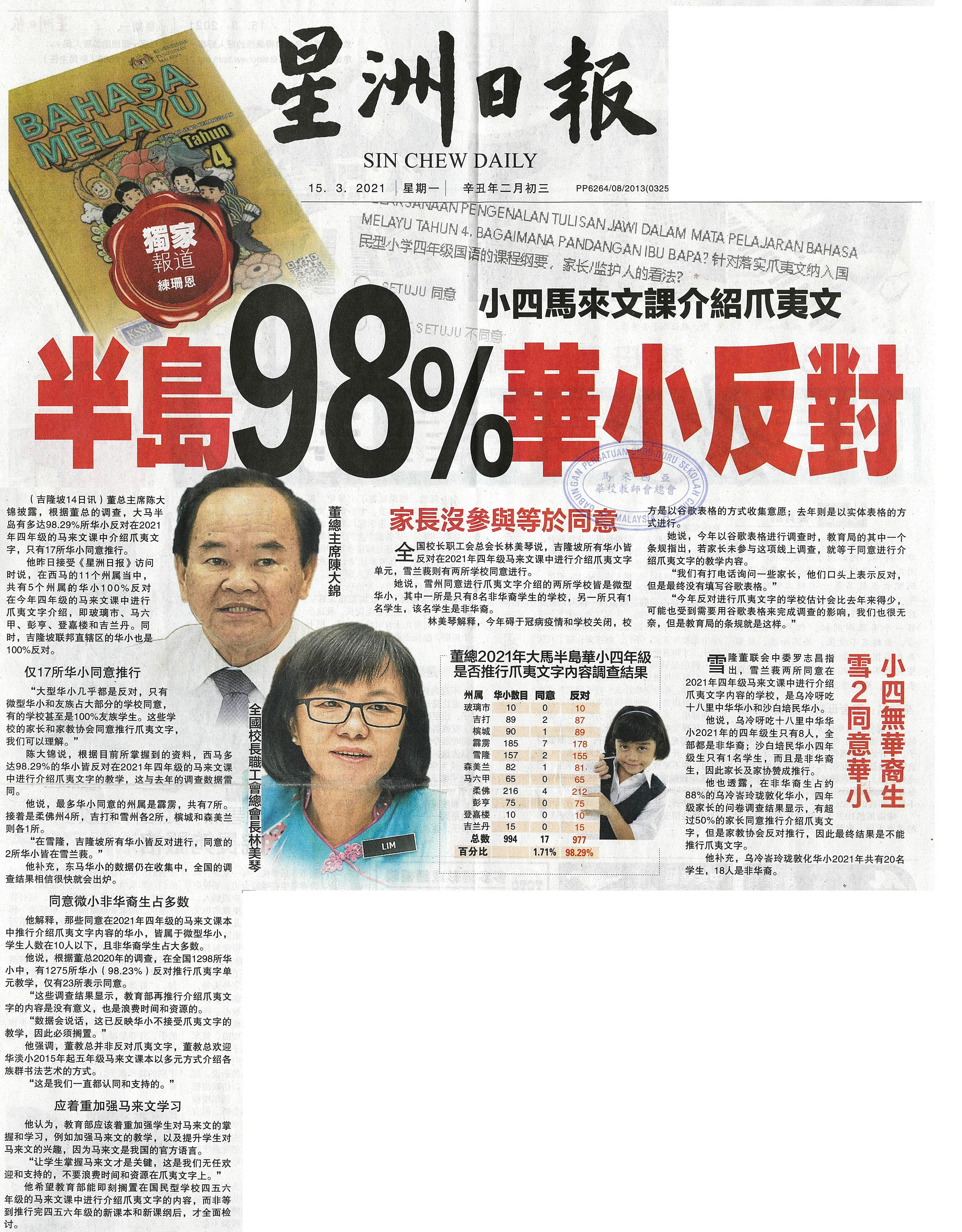 小四马来文课介绍爪夷文 半岛98%华小反对 WhatsApp 上一篇文章: 不敷600万盼教育部伸援 班丹中华建校 尚欠东风 上一页 下一篇文章: 金马梳华小再获2万建校金 新校工程2个月后完工 下一页