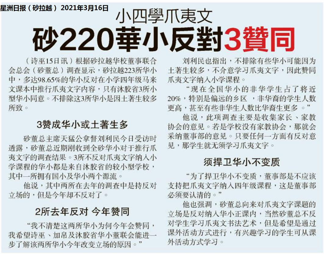 小四学爪夷文 砂拉越220华小反对3赞同