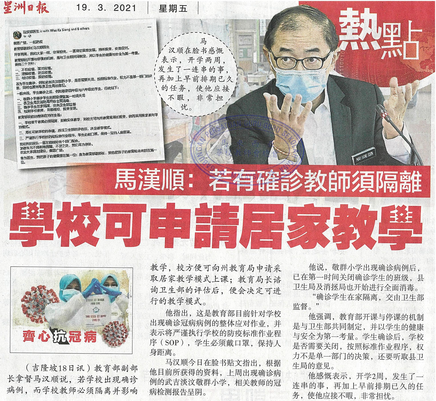 马汉顺:若有确诊教师需隔离 学校可申请居家教学