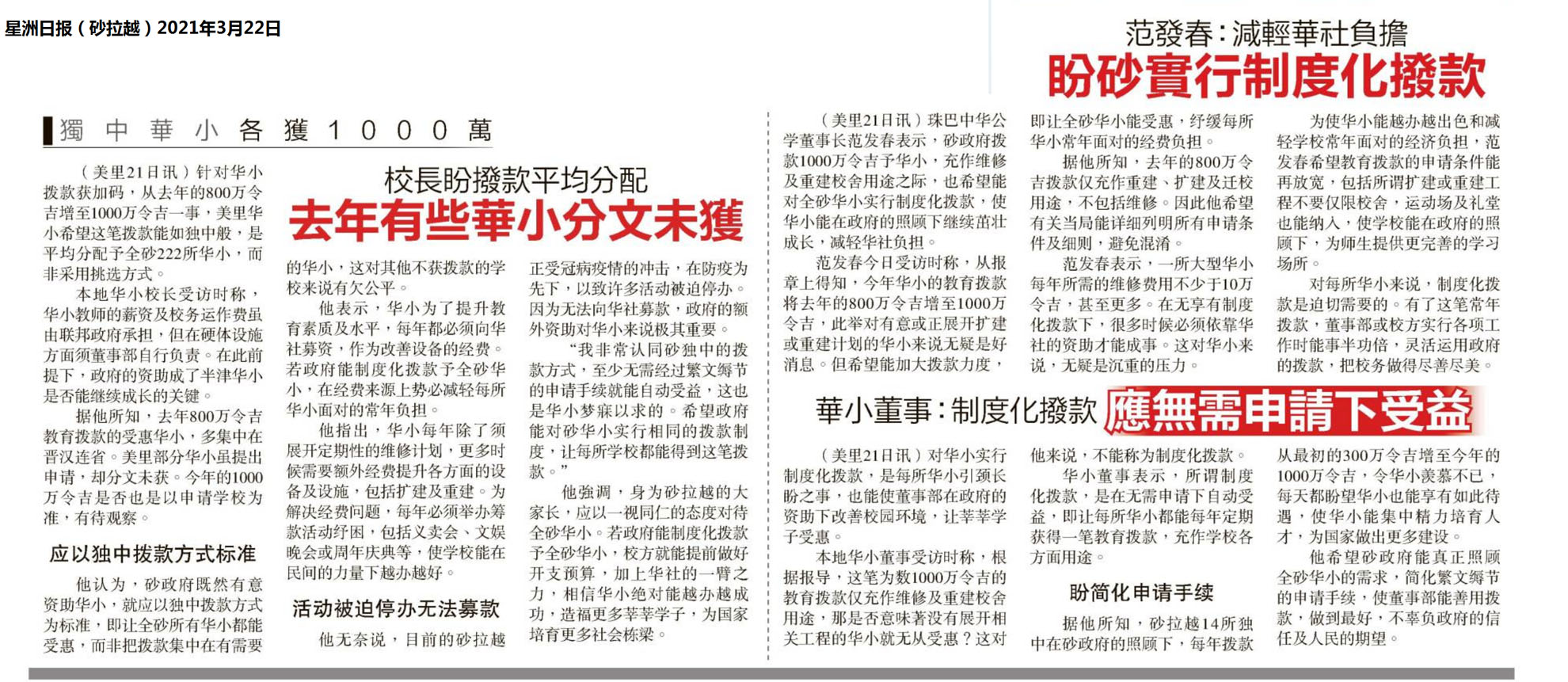 校长盼拨款平均分配 去年有华小分文未获
