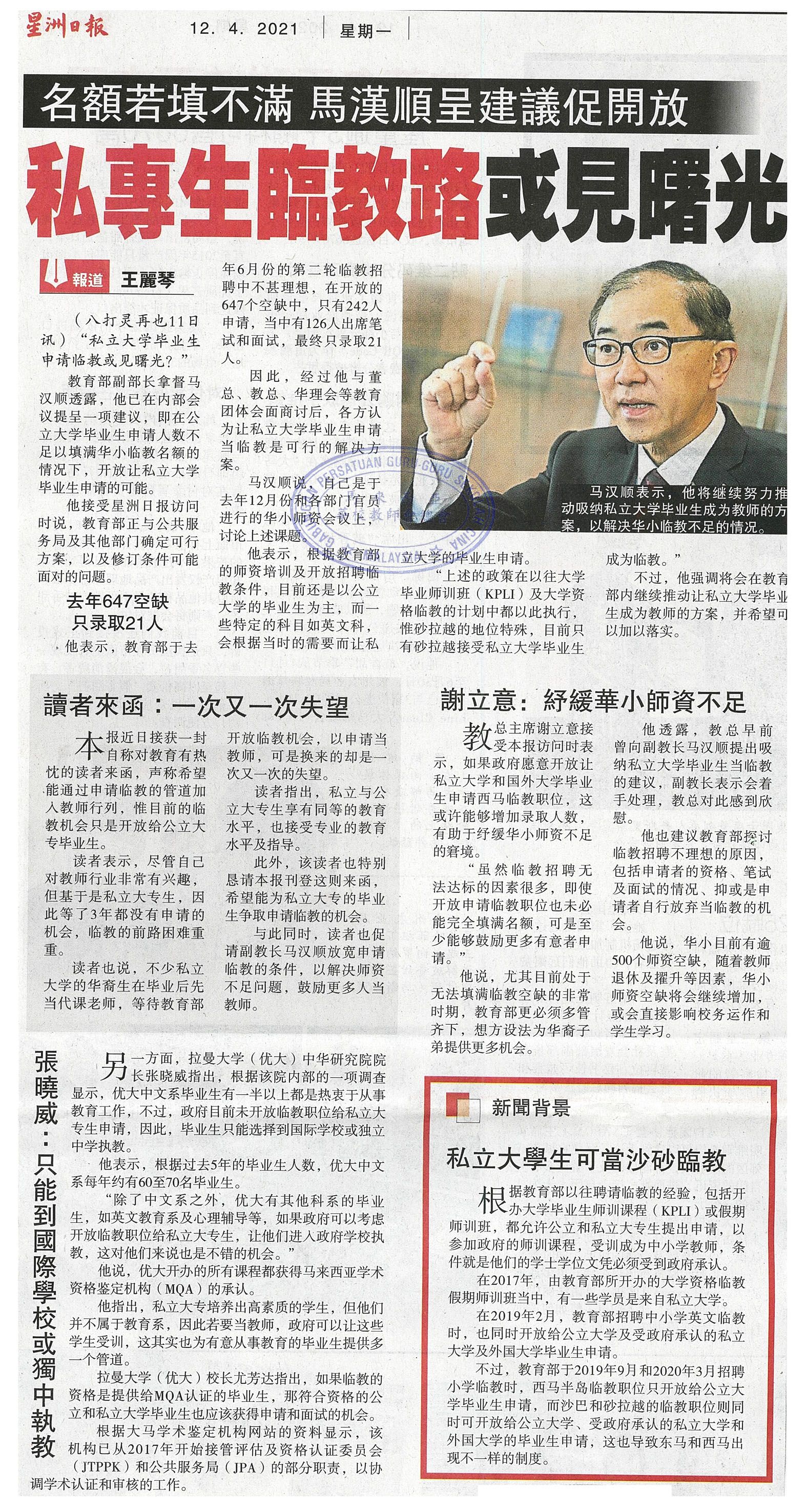 名额若填不满 马汉顺呈建议促开放 私专生临教路或见曙光 WhatsApp 上一篇文章: 巫裔技工有心栽培孩子 路途再远 也要读华小 上一页 下一篇文章: 迁校迎来7成友族生 新廊华小努力做到最好 下一页