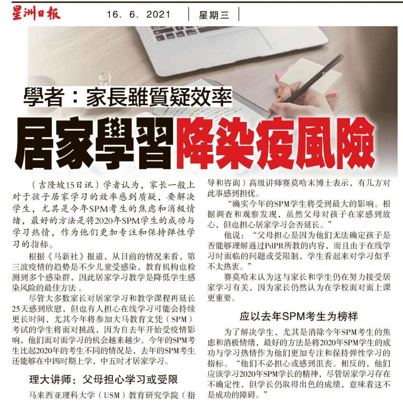学者:家长虽质疑效率 居家学习降染疫风险 WhatsApp 上一篇文章: 雪隆董联:华教组织可助填满名额 速公布PISMP录取详情 上一页 下一篇文章: 疫下考试平均积分表现佳 SPM成绩透明度惹疑 下一页