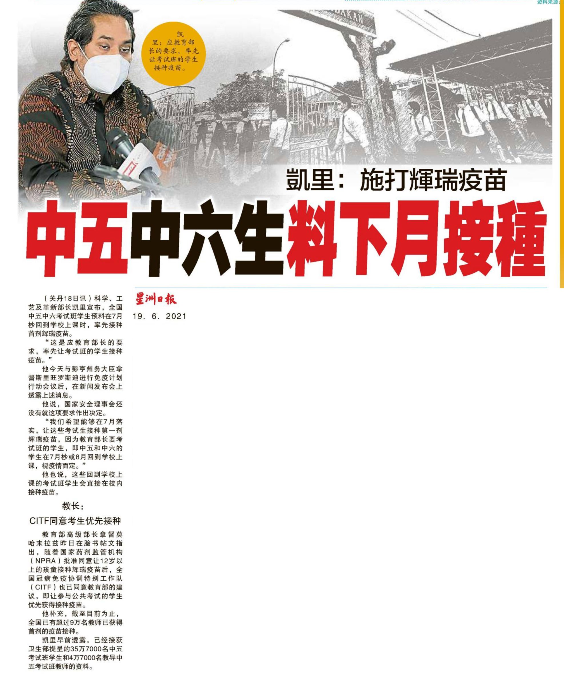 凯里:施打辉瑞疫苗 中五中六生料下月接种