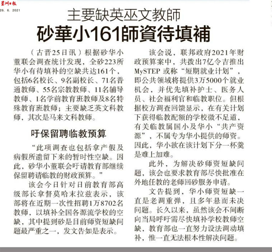 主要缺英巫文教师 砂华小161师资待填补