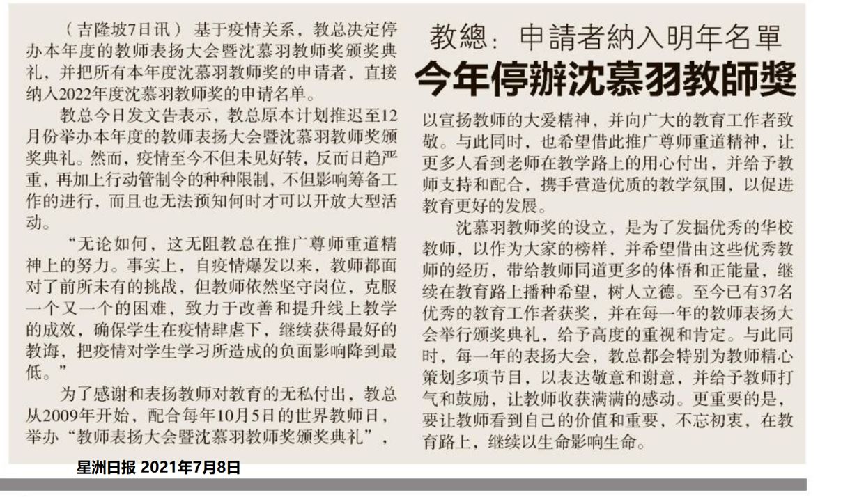 教总:申请者纳入明年名单 今年停办沈慕羽教师奖