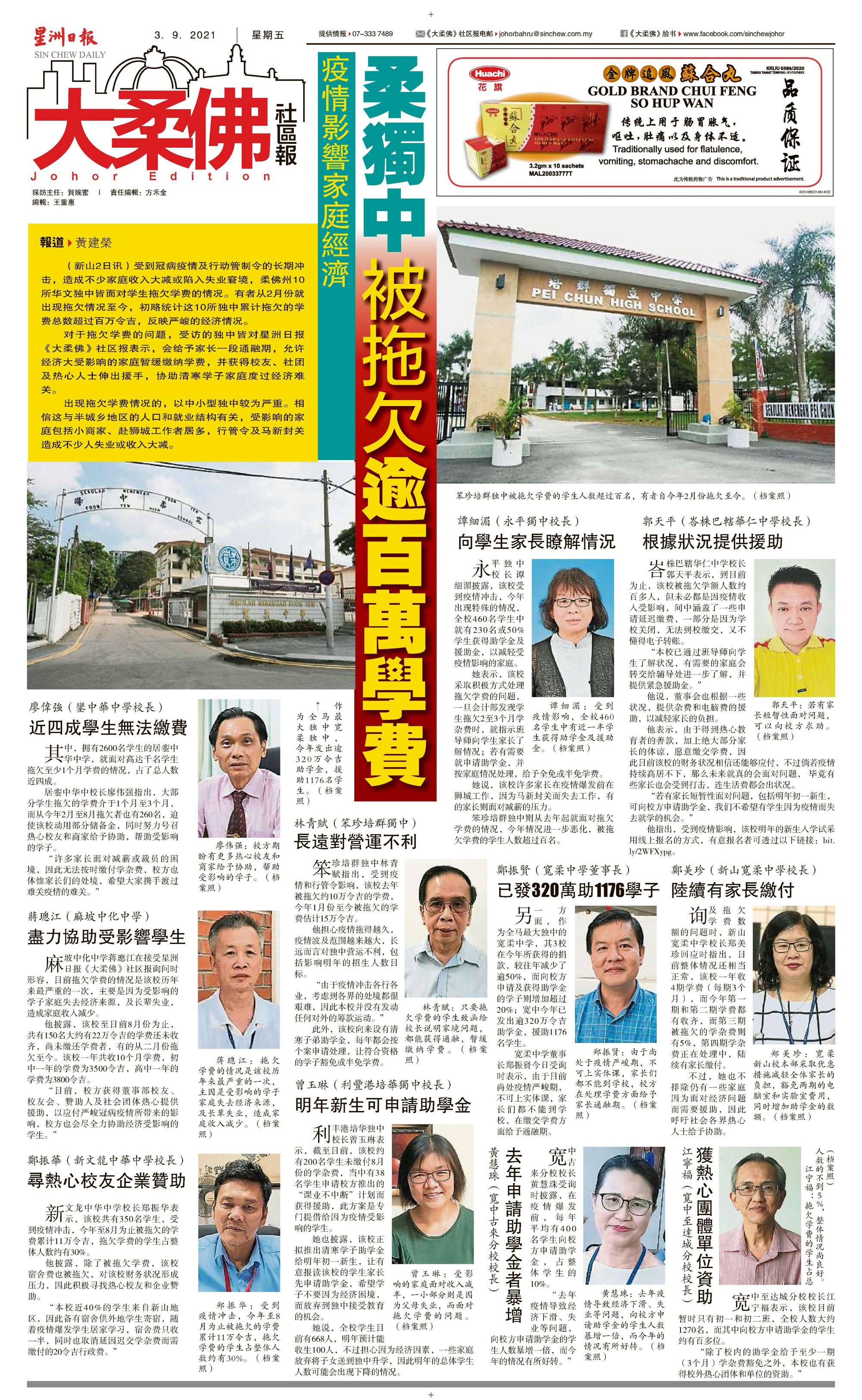 疫情影响家庭经济 柔独中被拖欠逾百万学费