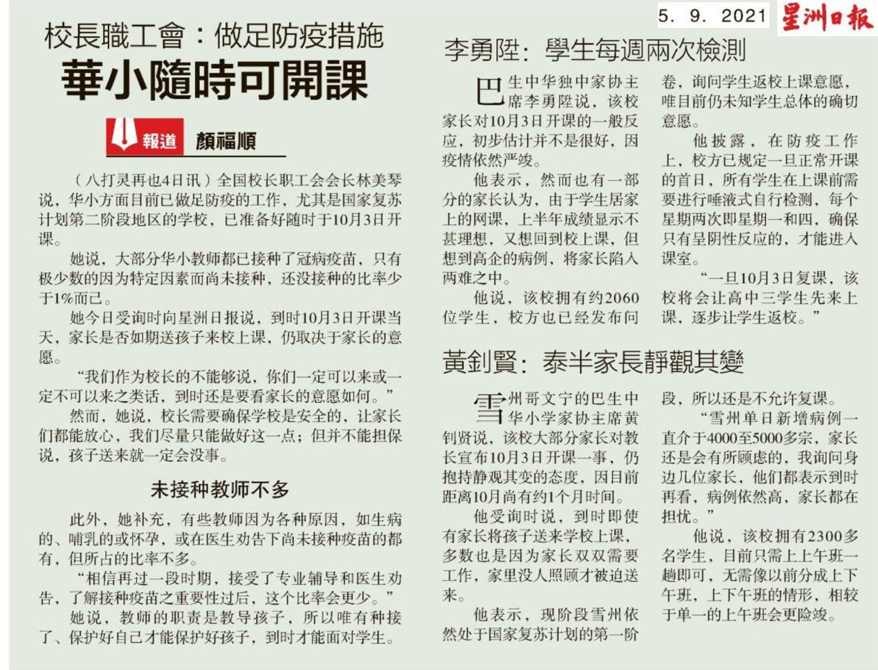 校长职工会:做足防疫措施 华小随时可开课