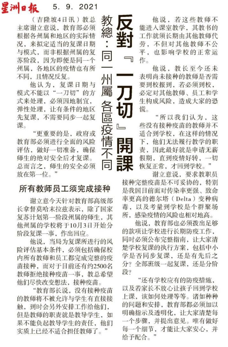 教总:同一州属各区疫情不同 反对“一刀切”开课
