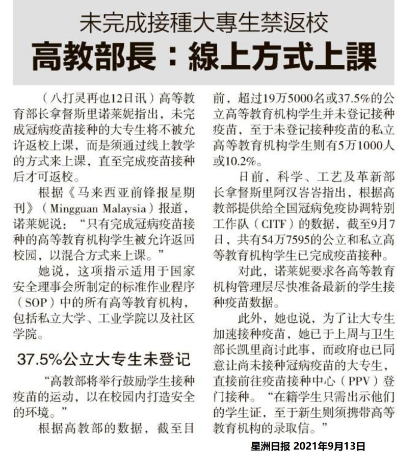 未完成接种大专生禁返校 高教部长:线上方式上课