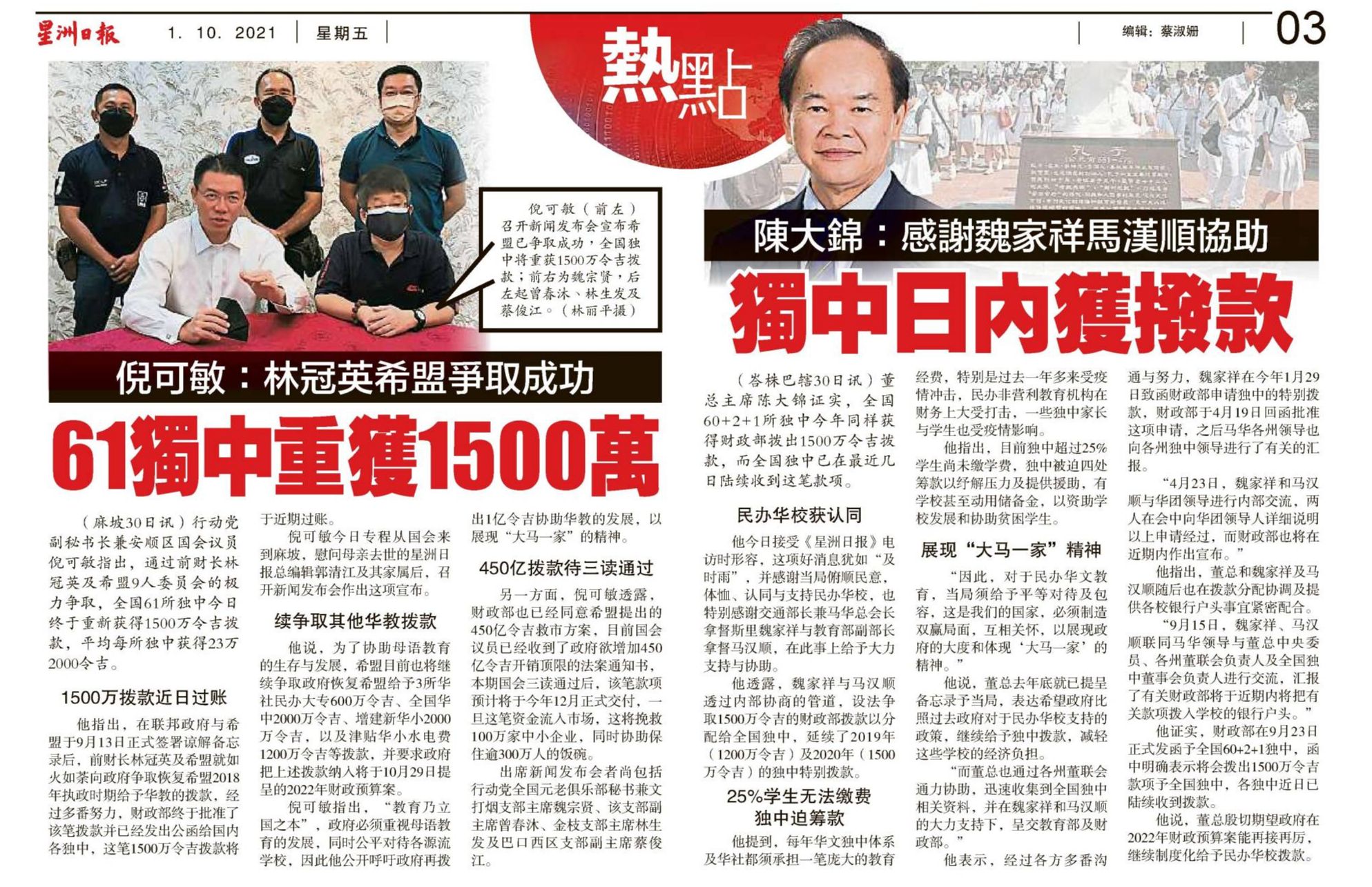 独中拨款剪报