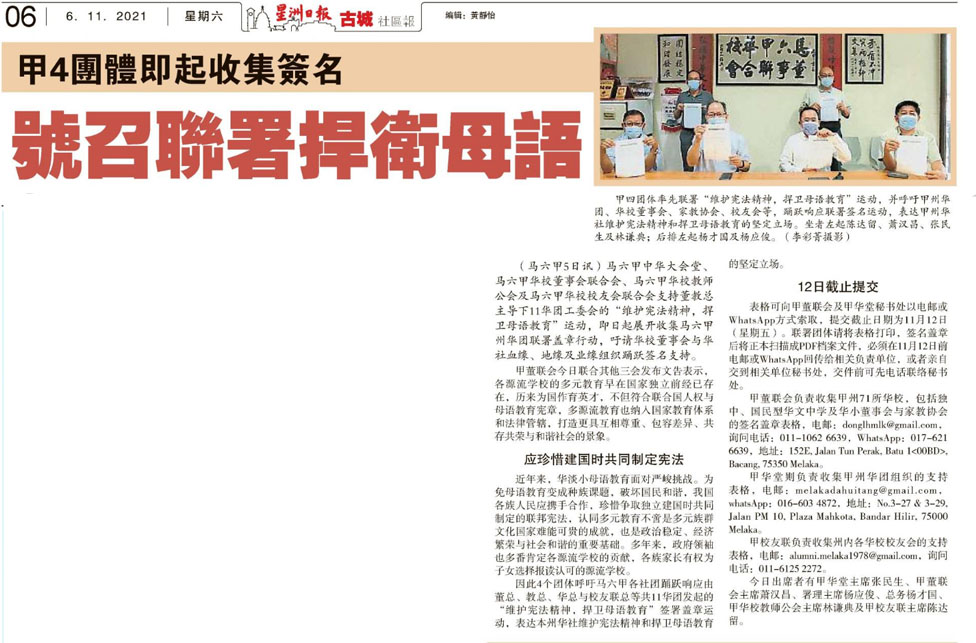 马六甲4团体即起收集签名 号召联署捍卫母语 WhatsApp 上一篇文章: 华淡小教爪夷字 董教总促听民意 “应搁置检讨非续推行” 上一页 下一篇文章: 新山中华公会五帮捍卫母语运动 责极端组织打压民主 下一页