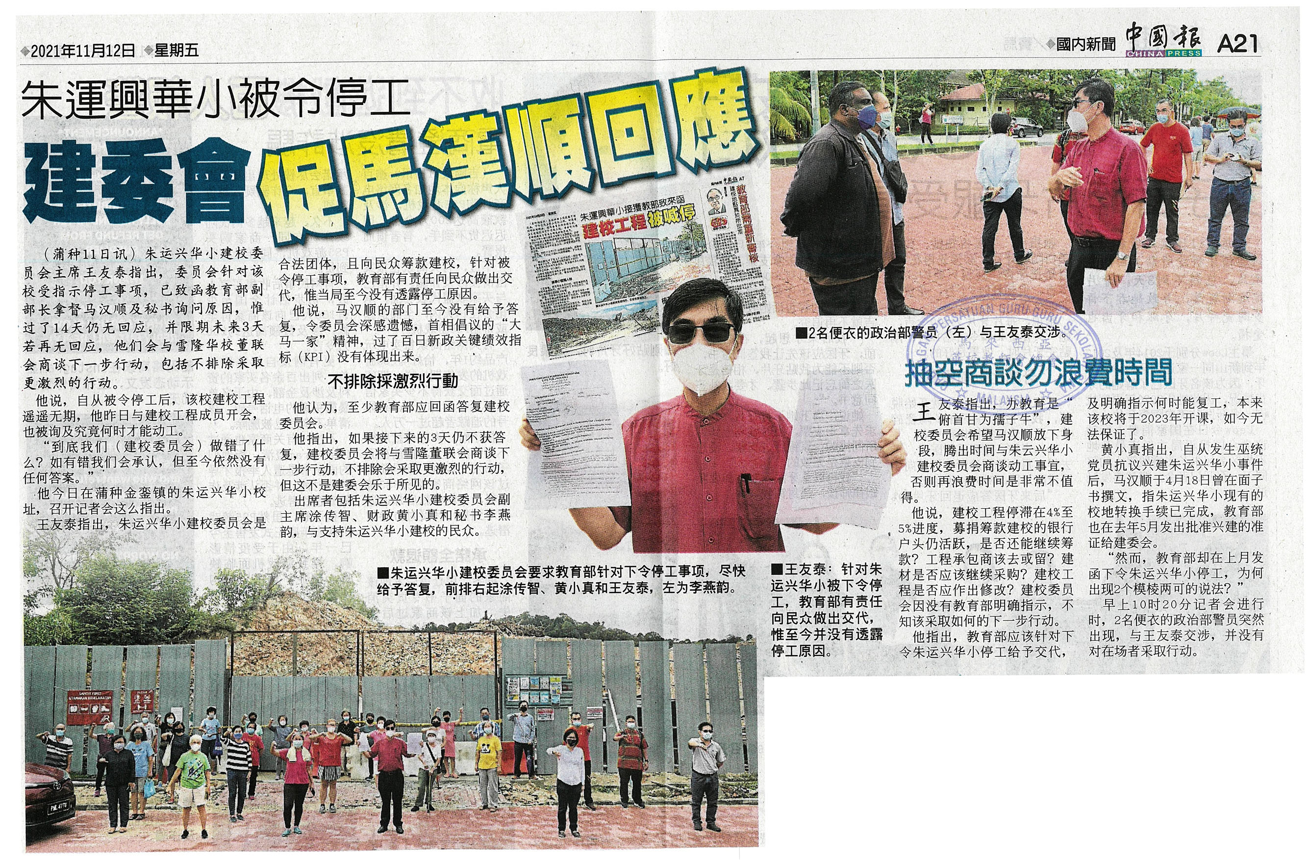 朱运兴华小被令停工 建委会促马汉顺回应 WhatsApp 上一篇文章: 马汉顺: 鉴定朱小迁校是否符SOP 教部仍在审核文件 上一页 下一篇文章: 妇女行动协会:月经检查禁令 需延伸至宗教玛拉私校 下一页