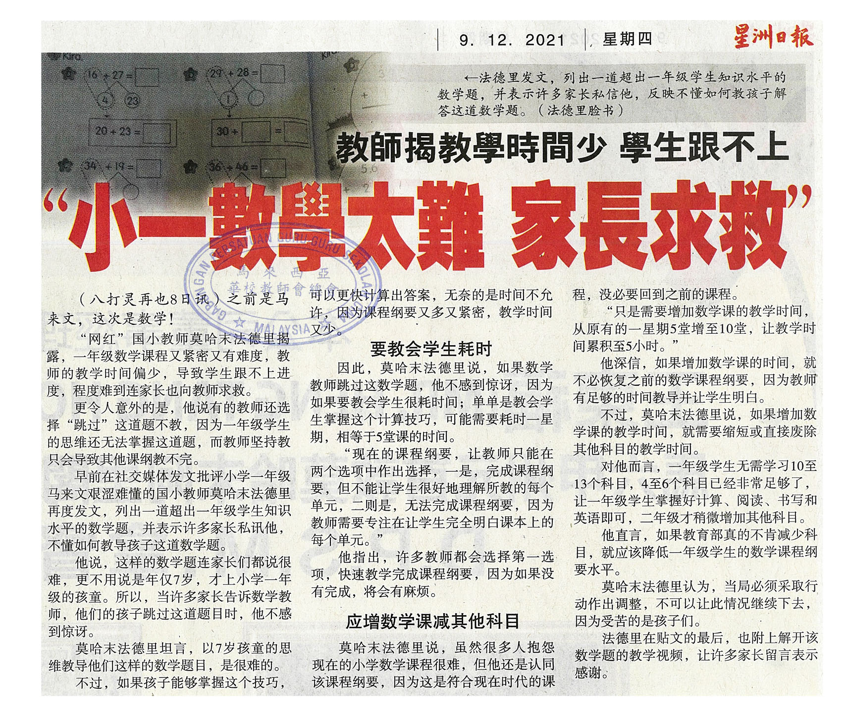 教师揭教学时间少 学生跟不上 “小一数学太难 家长求救”