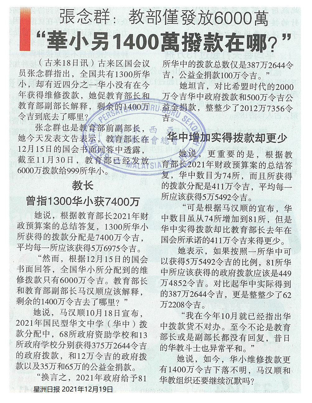 张念群:教部仅发放6000万 “华小另1400万拨款在哪?”
