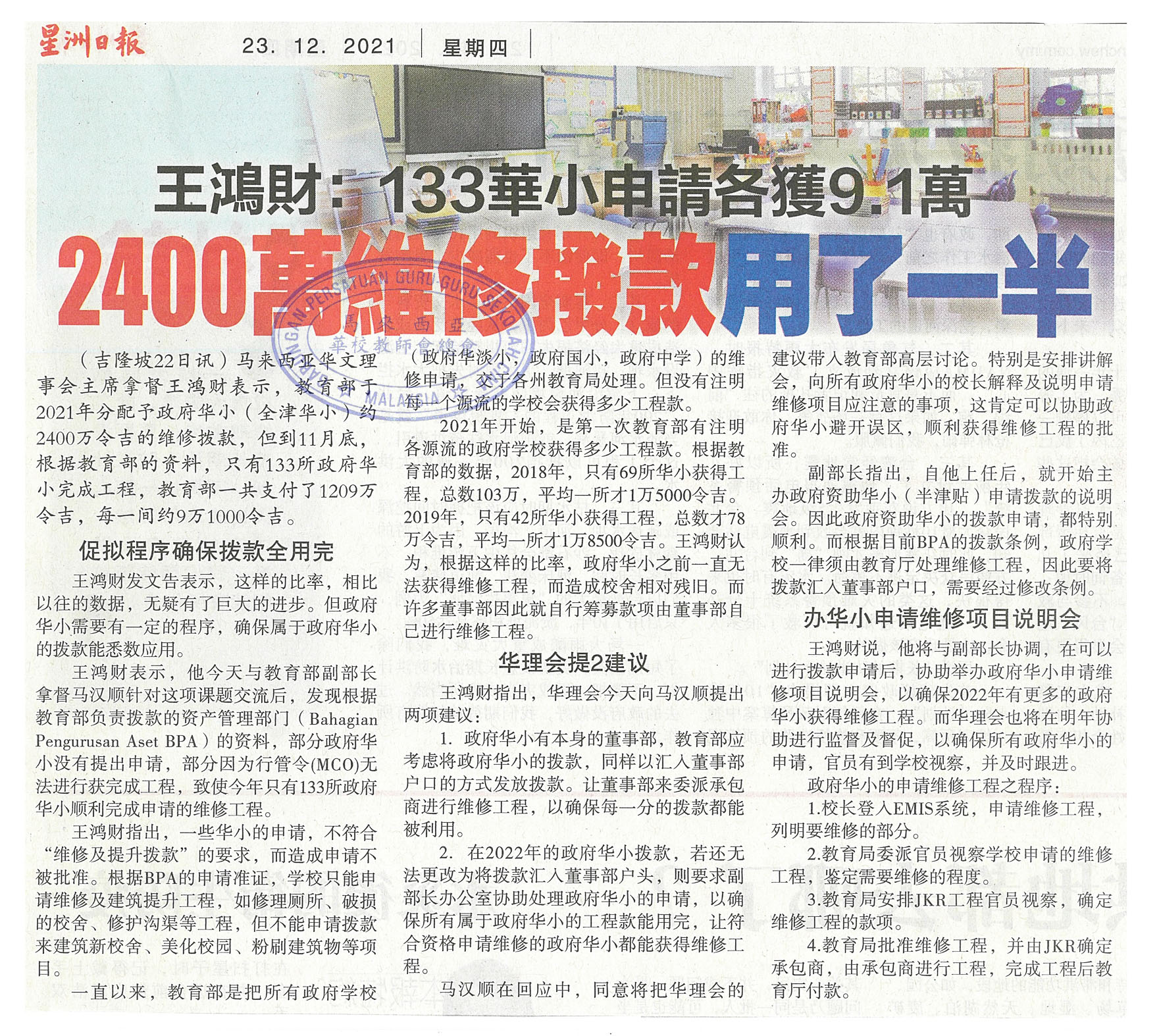 王鸿财:133华小申请各获9.1万 2400万维修拨款用了一半 WhatsApp 上一篇文章: 马汉顺:教师有晋升标准 升级看长期卓越服务 上一页 下一篇文章: 马汉顺回应张念群 “别炒作拨款挑华印情绪” 下一页