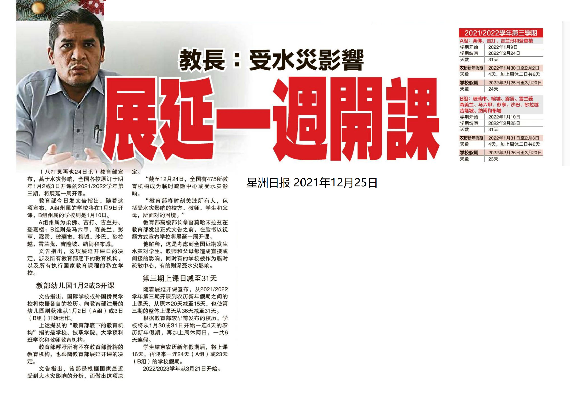 教育部长:受水灾影响 展延一周开课