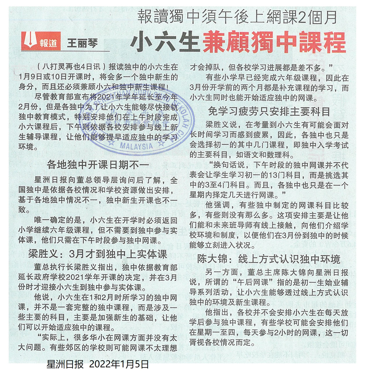 报读独中须午后上网课2个月 小六生兼顾独中课程