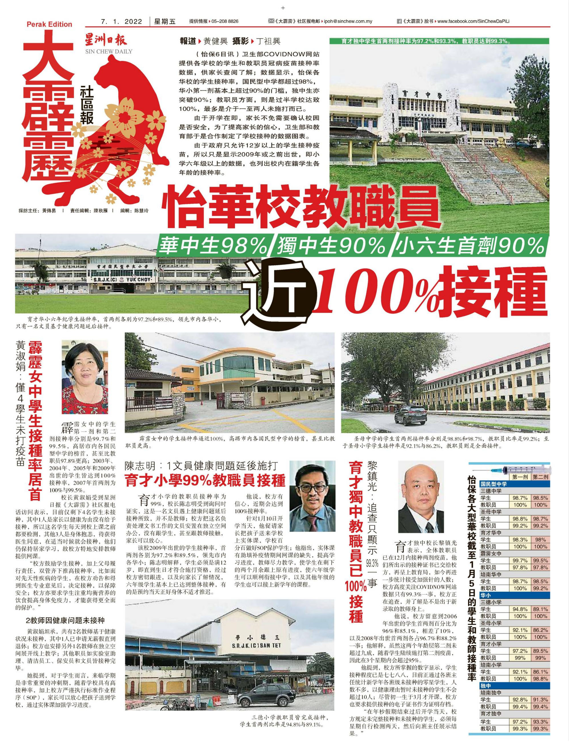 怡华校教职员 华中生98% 独中生90% 小六生首剂90% 近100%接种 WhatsApp 上一篇文章: 积极收拾残局 关丹受灾小学如期开课 上一页 下一篇文章: 轮班制上课影响业者 学校食堂免租2个月 下一页