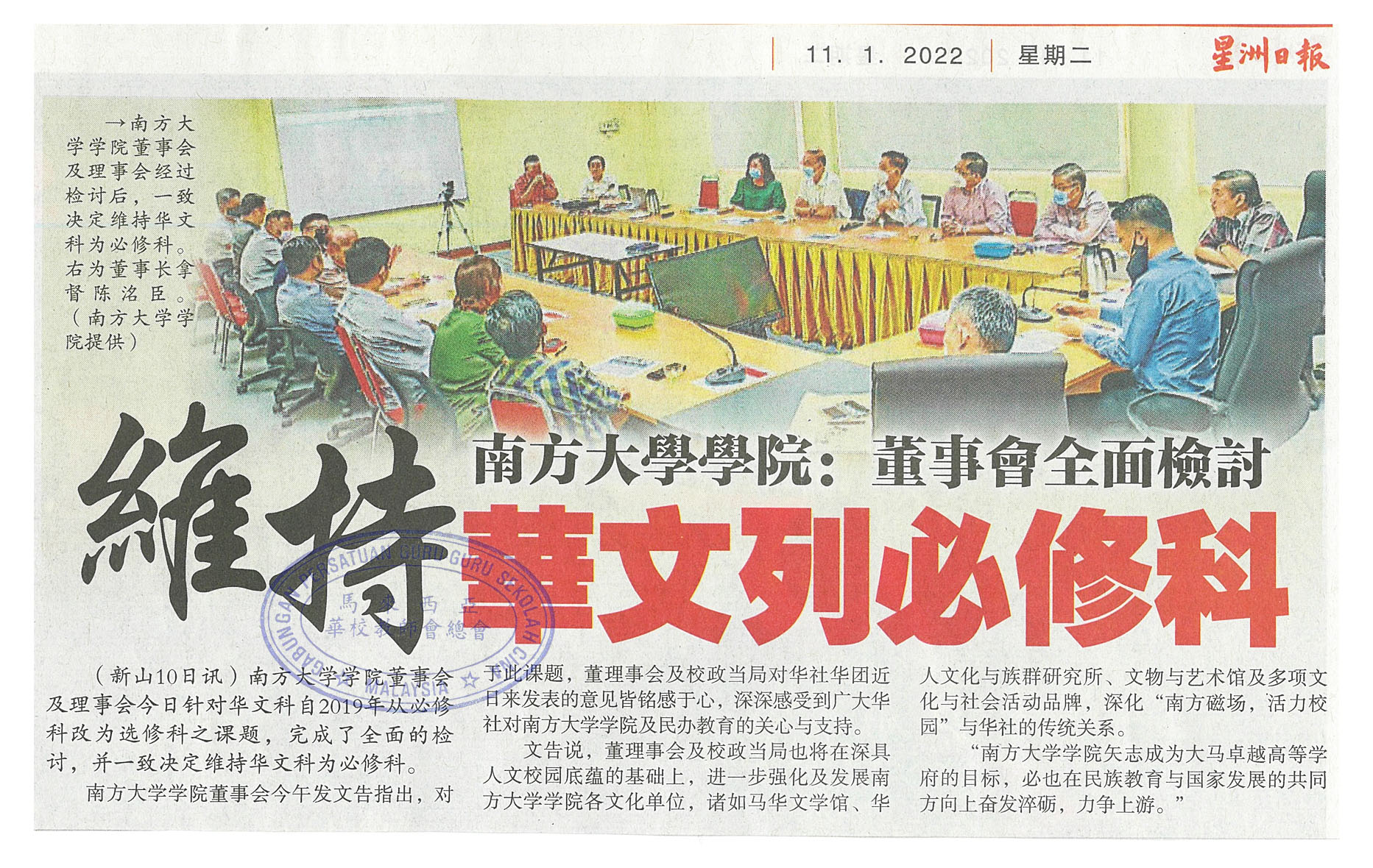 南方大学学院:董事会全面检讨 维持华文列必修科