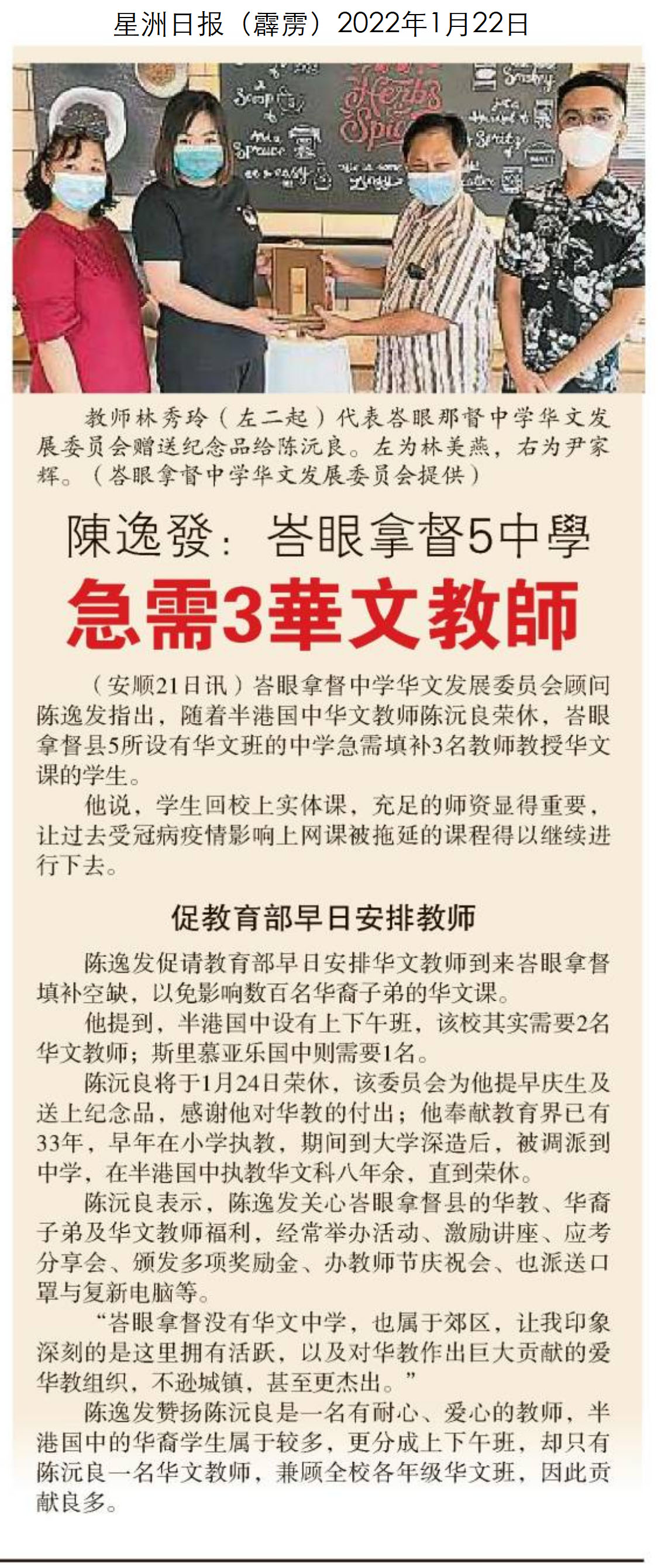 陈逸发:峇眼拿督5中学 急需3华文教师