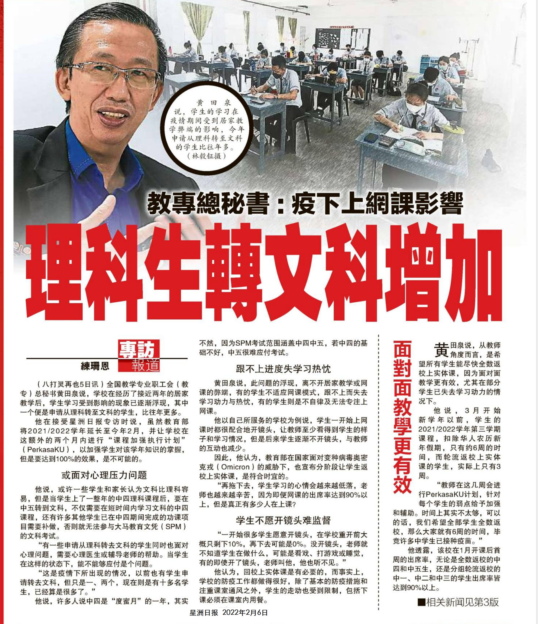 教专总秘书:疫下上网课影响 理科生转文科增加