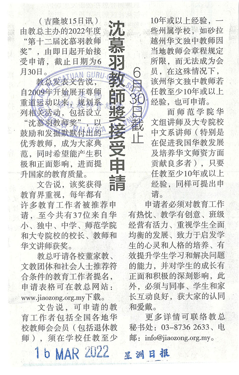沈慕羽教师奖接受申请 6月30日截止