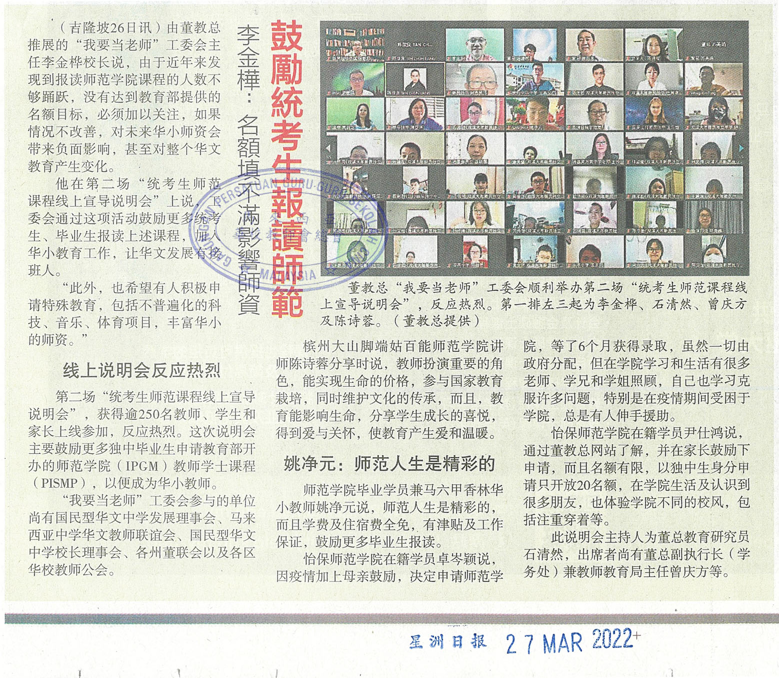 李金桦:名额填不满影响师资 鼓励统考生报读师范