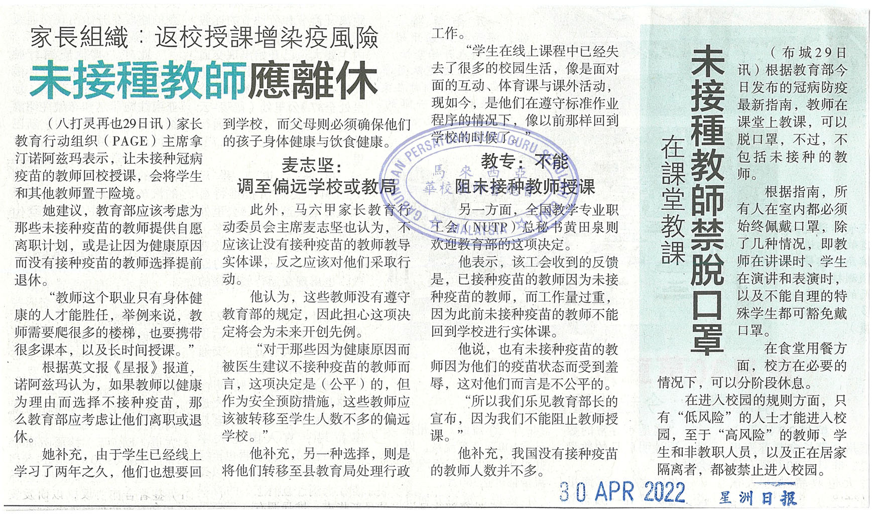 家长组织:返校授课增染疫风险 未接种教师应离休