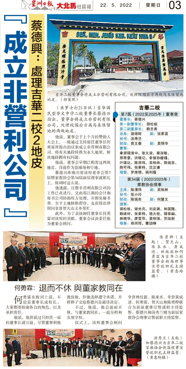 蔡德兴:处理吉华二校2地皮 成立非营利公司