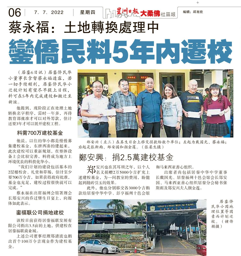 蔡永福:土地转换处理中 居銮侨民料5年内迁校