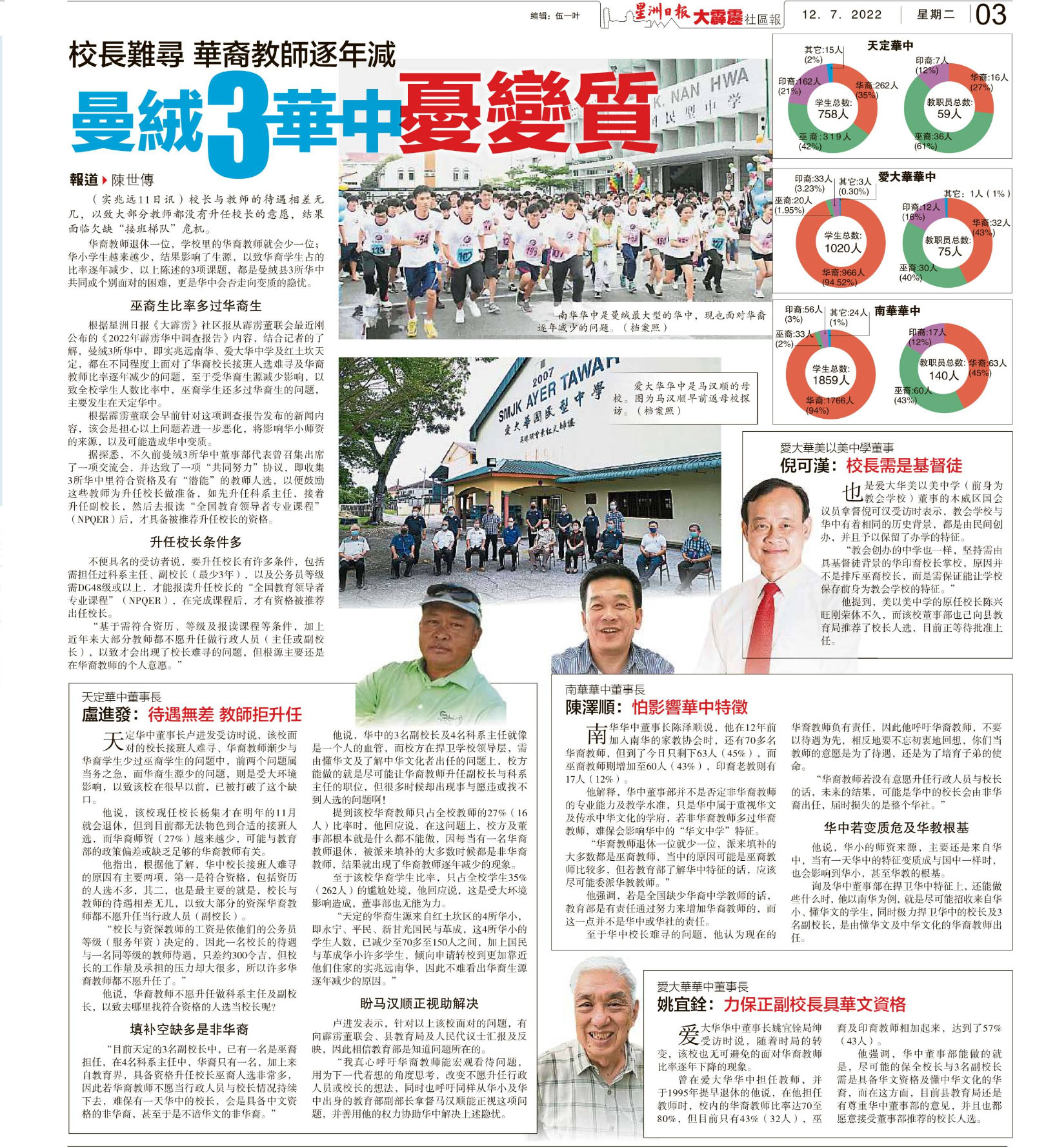 校长难寻 华裔教师逐年减 曼绒3华中忧变质 WhatsApp 上一篇文章: 每年20名额未曾填满 教育部缺宣传 华社不重视? 上一页 下一篇文章: STPM中文考题雷同事件 马汉顺将晤负责人讨论 下一页